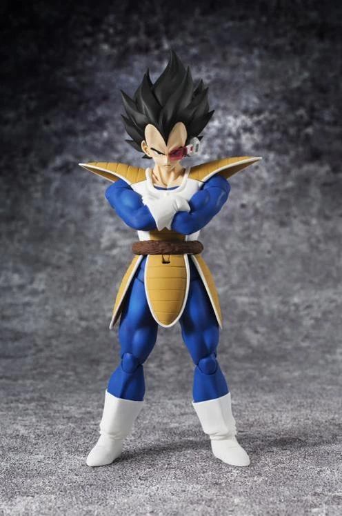 The prince of the fallen Saiyan, Vegeta, re-joins S.H.Figuarts with all new sculpting. Re-create dramatic scenes from the anime with incredibly life-like posing. The 160mm figure includes many accessories, including 2 pairs of optional hands, 2 optional facial expression parts, optional crossed arms, an optional head, a tail, a wearable Scouter, and a hand gripping a crushed Scouter.