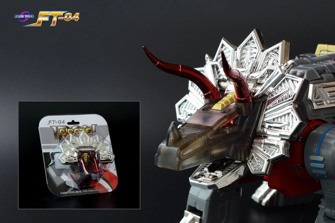 Fans Toys is releasing a special smoke colored Dino head to be used with FT-04 Scoria. This head can be used with all versions of FT-04 Scoria. The Dino head is clear smoke colored and will come with red chromed horns.