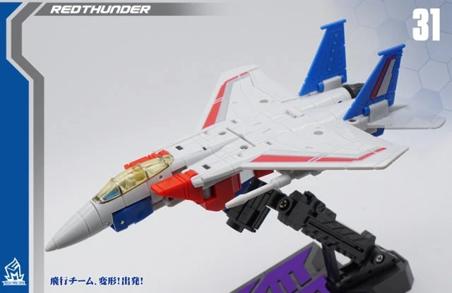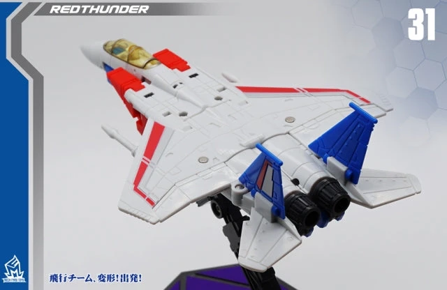From Mech Fans Toys, the MF-31 Redthunder figure stands a little over 4 in. tall, is legends-scaled, and transforms from robot mode to fighter jet mode, and back.