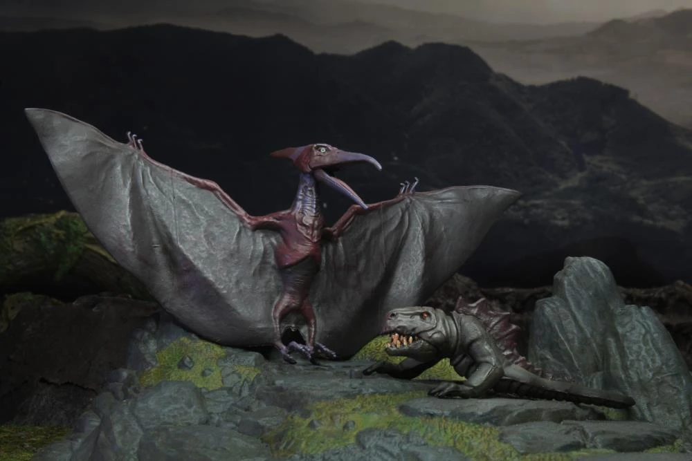 This massive figure has over 30 points of articulation. The figure includes two brand-new interchangeable heads (one with jaw articulation), 3 pairs of interchangeable hands, a pit monster, pteranodon, and tree trunk accessory.