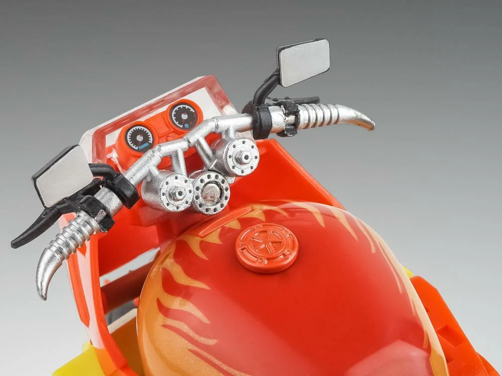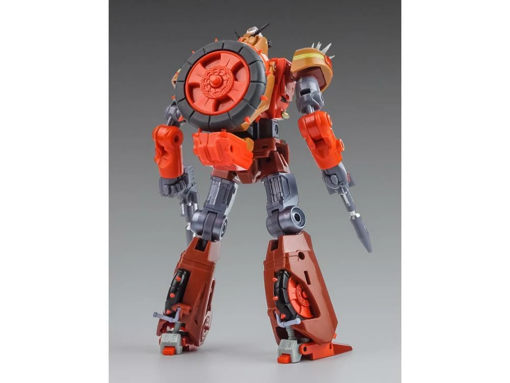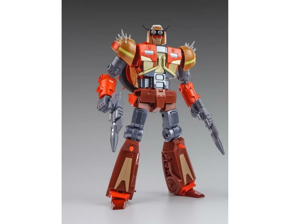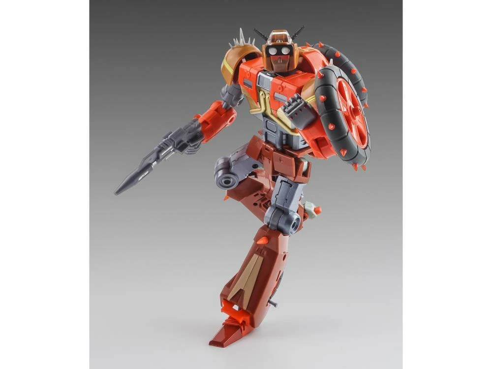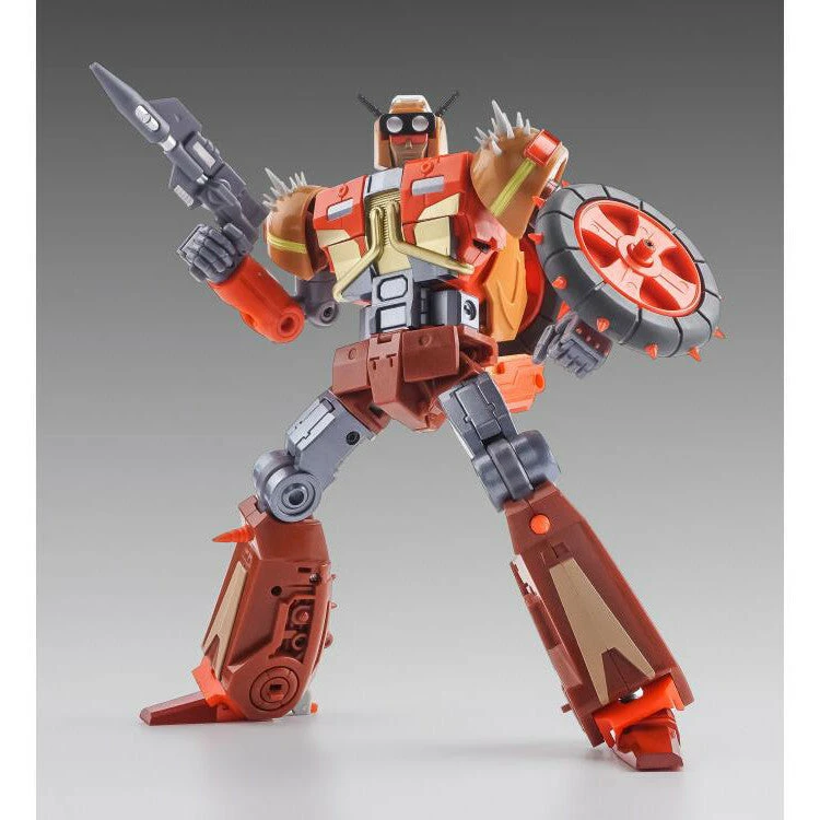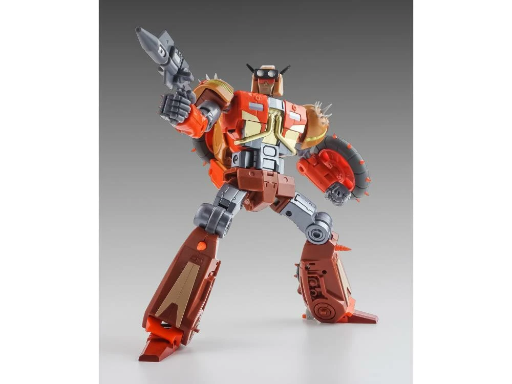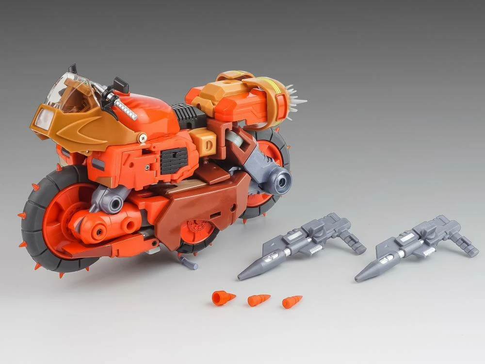 Gunker joins the E.A.V.I. Metal Phase figure series! He has a metallic paint finish, stands 8 inches in robot mode, and can transform into motorcycle mode. This articulated figure is made of ABS plastic, featuring rubber tire spikes and die-cast feet and thighs.