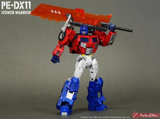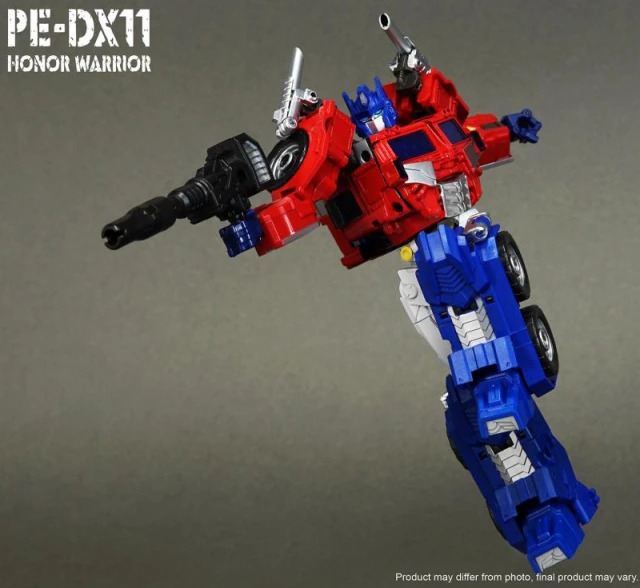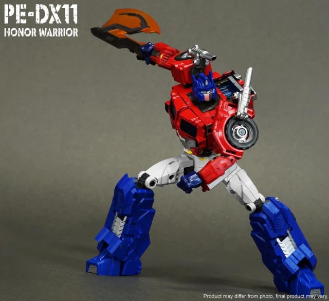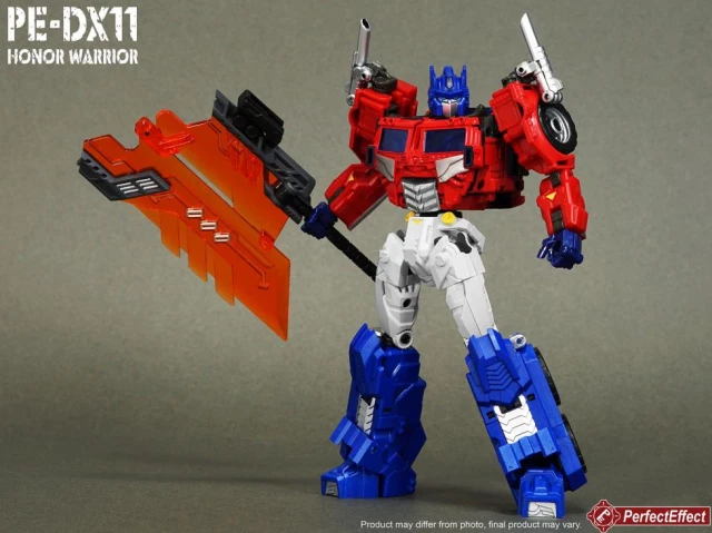 Perfect Effect welcomes the PE-DX11 Honor Warrior figure! Honor Warrior transforms from robot mode to truck mode, and also includes a battle axe, blaster rifle, and energy sword.